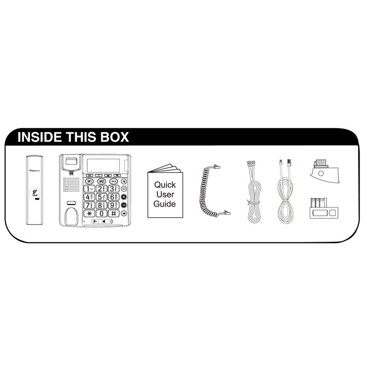 Contents: 1 x Corded Telephone, 2 x Telephone line connector